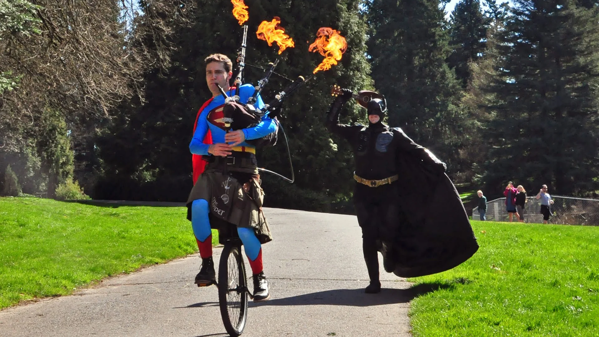 Batman Upstaged By Unicycling Superman Playing Flaming Bagpipes