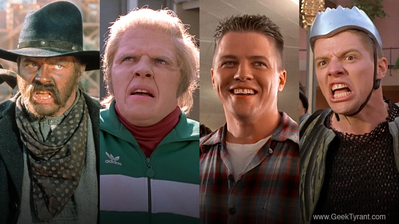 Thomas F. Wilson played most of the branches of his character’s manure-covered family tree in the Back to the Future films. In addition to playing the young bully Biff Tannen in the first two films, Wilson played a middle-aged version of the character in at least three alternate timelines throughout the trilogy. He also played Biff's equally disgruntled grandson, Griff, in Part II. In Part III, Wilson portrayed the most dangerous and loathsome member of the Tannen family, Biff’s outlaw great-grandfather, Buford "Mad Dog" Tannen.