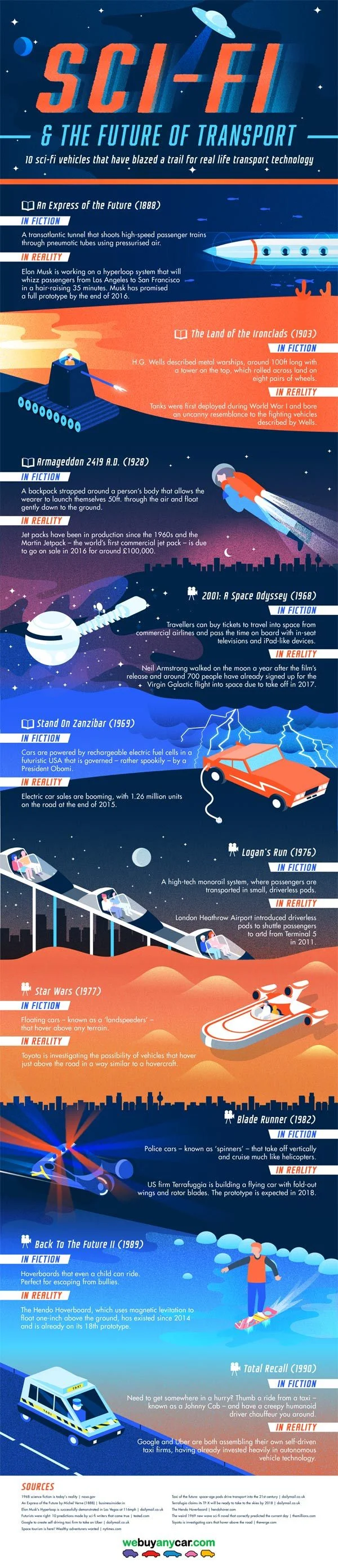 I have a fun infographic here for you to check out today that breaks down some of the sci-fi transportation technology that has been written about and shown in movies over the past 130 years and how it's have inspired real life transport technology. The infographic lists ten of these fictional vehicles. Unfortunately, street-legal flying cars still don’t exist…yet.