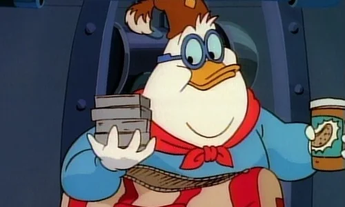 Gizmoduck is freakin’ awesome, and one of my all time favorites. He’s Launchpad's old friend and Darkwing Duck’s rival superhero. He originally appeared as a recurring character in DuckTales. Darkwing hates that Gizmoduck completely overshadows him in fame and attention whenever he’s in St. Canard, and they team up. Of course, Darkwing comes to accept who he is and his lack of powers when he saves Gizmoduck from Megavolt in the episode "Up, Up and Awry".