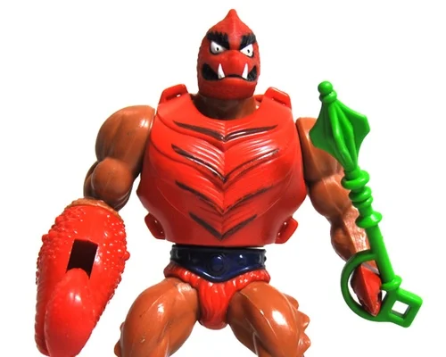 He's a man and a lobster… or a crab hybrid. He has one giant claw that can crush things and a little claw for use in everyday activities, like holding a mace to beat people with. All I know is that he looks like some kind of scientific experiment gone wrong. Hell, all of the these He-Man action figures do!