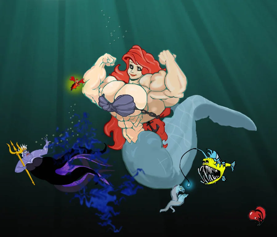 Ariel would eat more of that sea spinach and give Eric the most sensual and sexual thrill rides of his life. She loved to show off her rippling muscles and ripping gigantic boulders from their foundations and holding them over her head with one hand. She even went so far as lifting the ship itself with Eric on it. It felt so good to exert her incredible strength like this. She would also turn into mermaid form and with Eric on their ship, she'd use her spinach enhanced strength to push the ship across the waters as fast as a modern day speed boat.