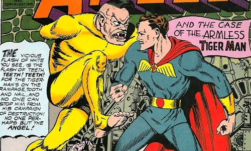 Armless Tiger Man was introduced in Marvel Comics the 1940s. His real name is Eric Hertz, and he worked in a mechanical laboratory in Germany. His arms ended up being caught in a machine and were ripped off. He developed a strong hatred for machines because of that bad experience, and started working on building strength in his mouth and legs. He even sharpened his teeth into fangs for weapons, and his above average strength allows him to bend steel with his mouth. His toes are also very dexterous, allowing him to throw daggers with them.