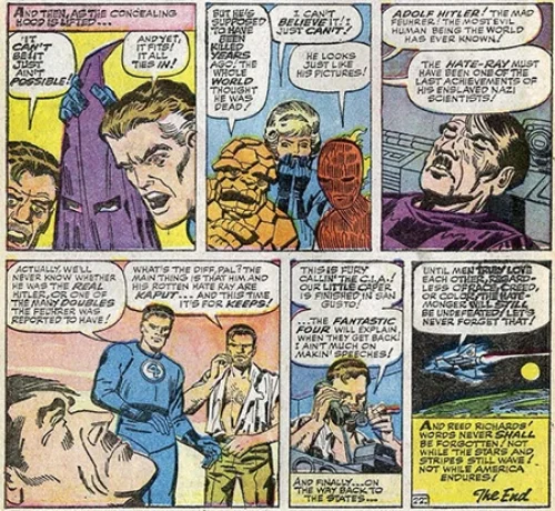 So in 1963, 20 years after WWII ended, Stan Lee thought it would be a good idea to clone Hitler and turn him into a villain called the Hate-Monger. He was a purple KKK hooded racist, and was cloned with the real Hitler's consciousness, which was transferred into the clone body upon his death. He didn’t have any super villain powers, just a special gun called the Hate Ray, which literally shoots out rays of hate, causing people to fight each other. He used it against the Fantastic Four once, and they beat the living shit out of each other.