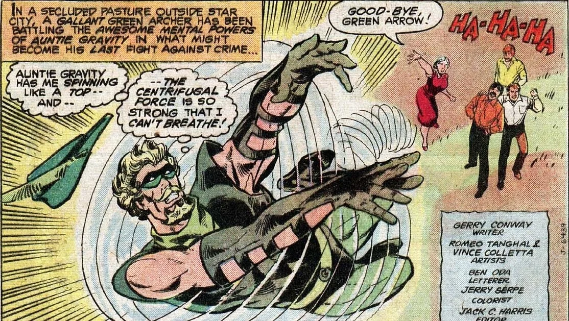 Background: Auntie Gravity was, as her name would imply, not a mother. This woman somehow developed anti-gravity ("GET IT?!" said some 1980s comic writer) powers and went on a crime spree with her nephews. Oliver needed the help of Black Canary to take her down. Look at the above picture. I'd put this woman in her late 50s at best, and one of her nephews looks like Ringo Starr. How do you defeat an evil old woman with anti-gravity powers? I would suggest stealth and a quick arrow to the back of the head. Oliver took the high road and it took him two issues to do it.
