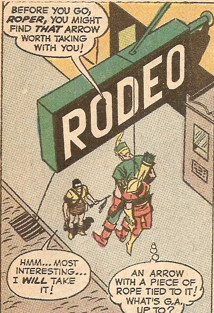 Master or ropes, or perhaps farts if you only knew him from the above panel. Roper, as you probably guessed, uses ropes to incapacitate Ollie and Roy when they first meet. Roy is flabbergasted, but Oliver appears sympathetic to the villain's plights and encourages him to take one of his rope arrows. A couple more encounters happen with each one resulting in The Roper grabbing more and more rope arrows. Eventually Green Arrow and Speedy are captured by "glow in the dark" rope that blinds them. Right when it seems like their darkest hour, Oliver tells Roper there is one final rope arrow in his quiver. Roper grabs it and is entangled in ropes. THE MASTER OF ROPES FAILS TO ESCAPE and is arrested. This story gets much weirder than this so head on over to SlayMonstroBot to get the director's cut.