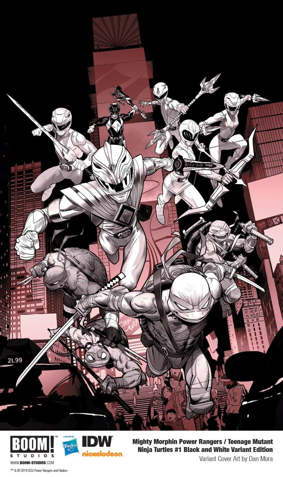“MIGHTY MORPHIN POWER RANGERS/TEENAGE MUTANT NINJA TURTLES #1 BLACK AND WHITE LIMITED EDITION features a black and white variant of Dan Mora’s main cover art and Simone di Meo’s stunning original line art laid out in contrasting shades of black and white[.]”