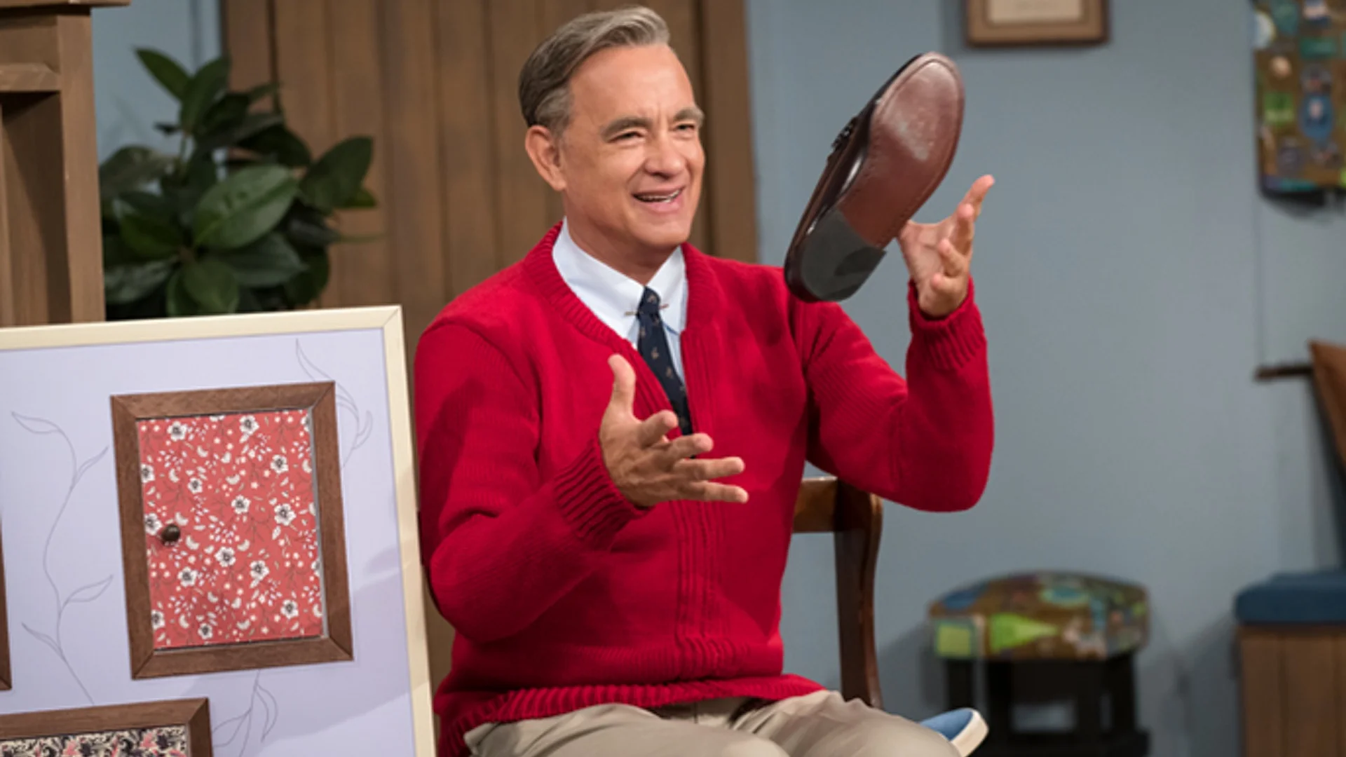 The photo is of Oscar-winning actor, and America’s sweetheart, Tom Hanks doing the iconic shoe change that Mr. Rogers would do every time he came in the door while singing the theme song to Mister Rogers’ Neighborhood, A Beautiful Day in the Neighborhood. The movie also stars Matthew Rhys (The Americans), Chris Cooper (American Beauty), Susan Kelechi Watson (This is Us), and many more.