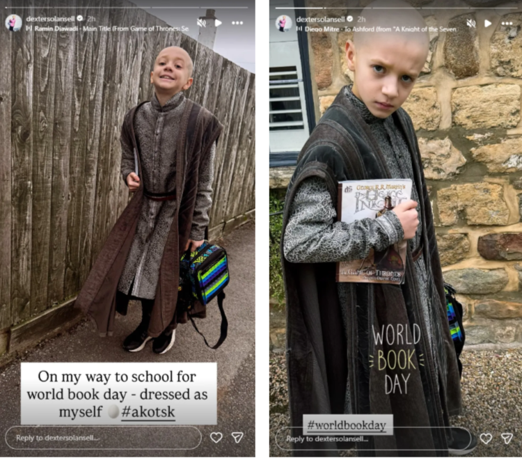 Ansell posted a couple of photos on his Instagram stories of him in costume, headed to school for World Book Day, which is celebrated in UK grade schools, where kids dress as their favorite literary character, and receive a voucher to spend on books.
