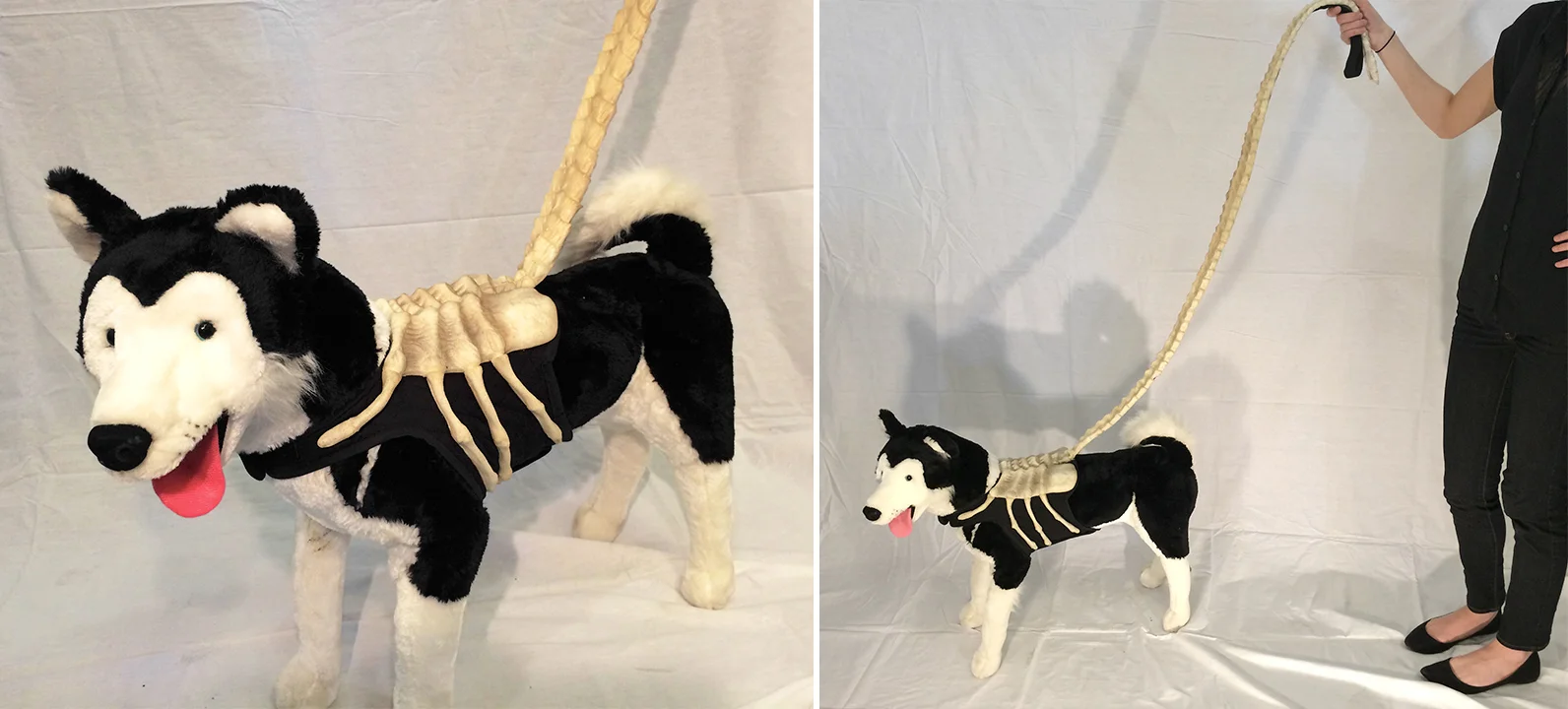 Designed to fit a small to medium sized dog, 15-35 pounds. This leash connects with velcro around the neck and chest of the dog securing the Face Hugger to your pets back. The alien is made of foam and airbrush painted, the harness is a light weight but durable mesh. The leash is hidden within the tail of the alien and ends with a loops for easy walking.