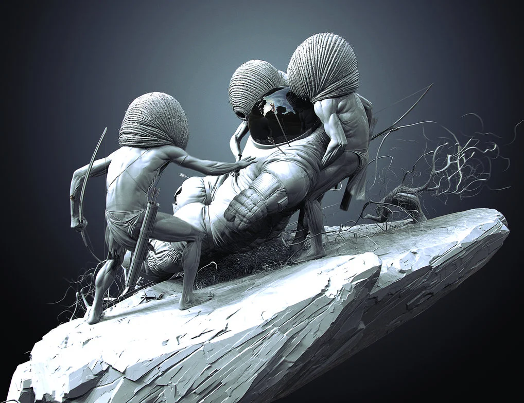 Here's a fantastic sci-fi themed illustration called "help" that features an alien helping a wounded astronaut. It was created by Deviant Art user Svjeeta, and I love the tone. I want to know what the story is behind it. I've also included a render of a different scene from the same artist below.