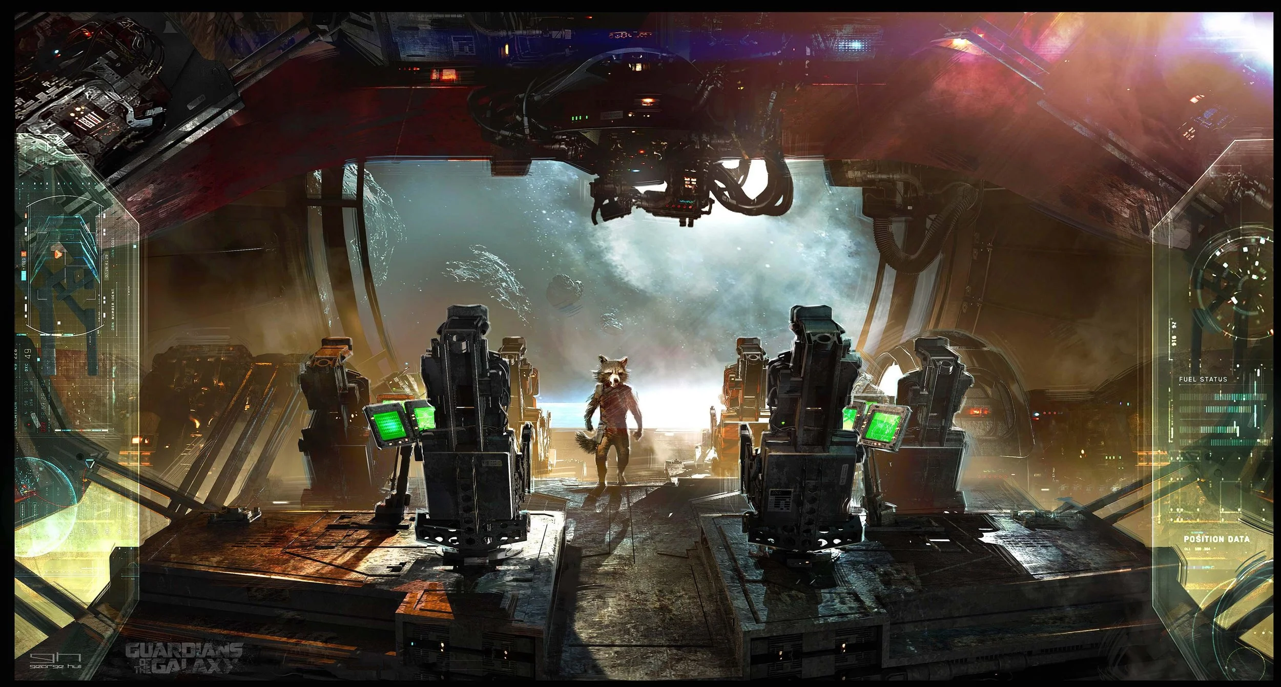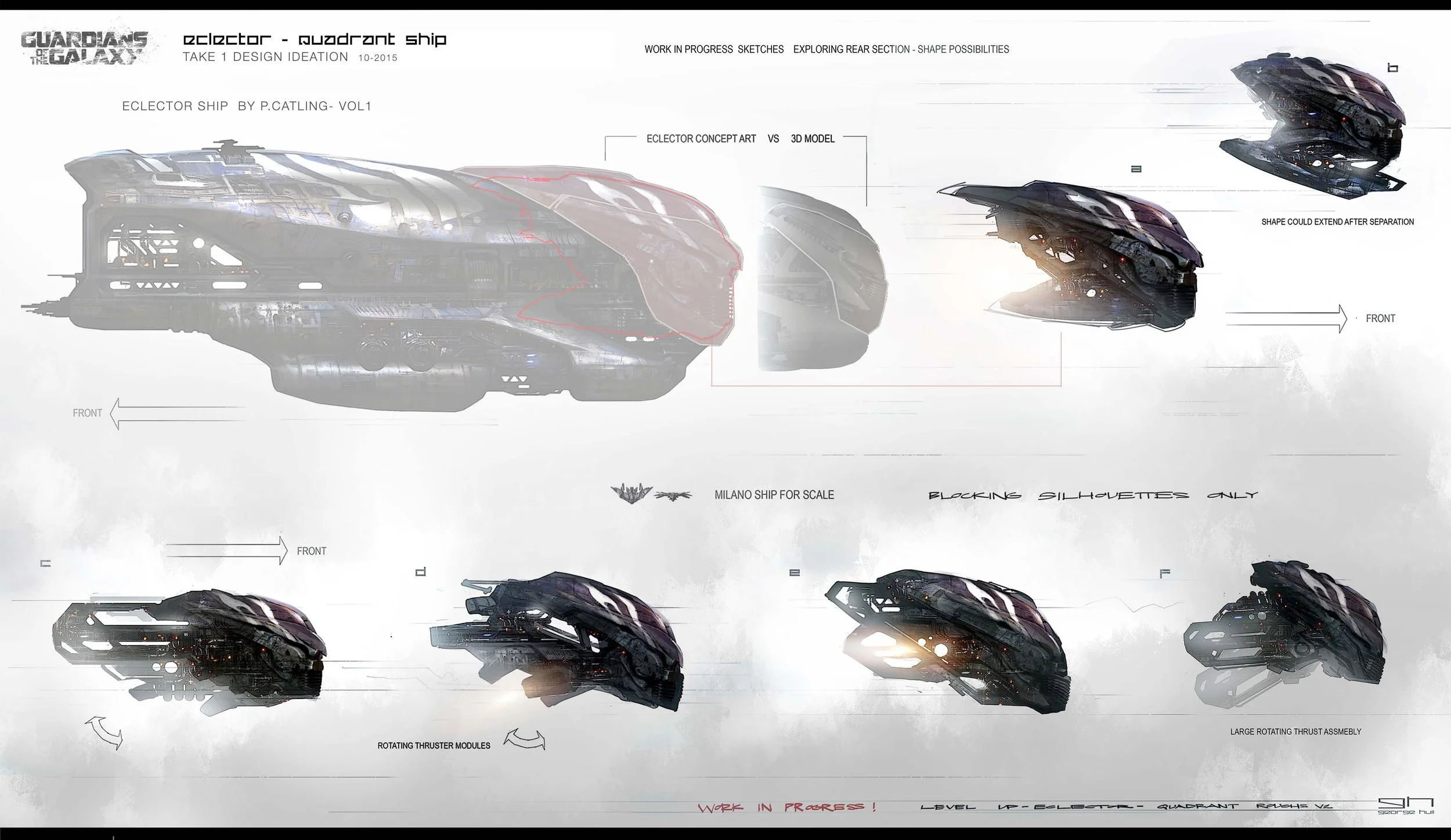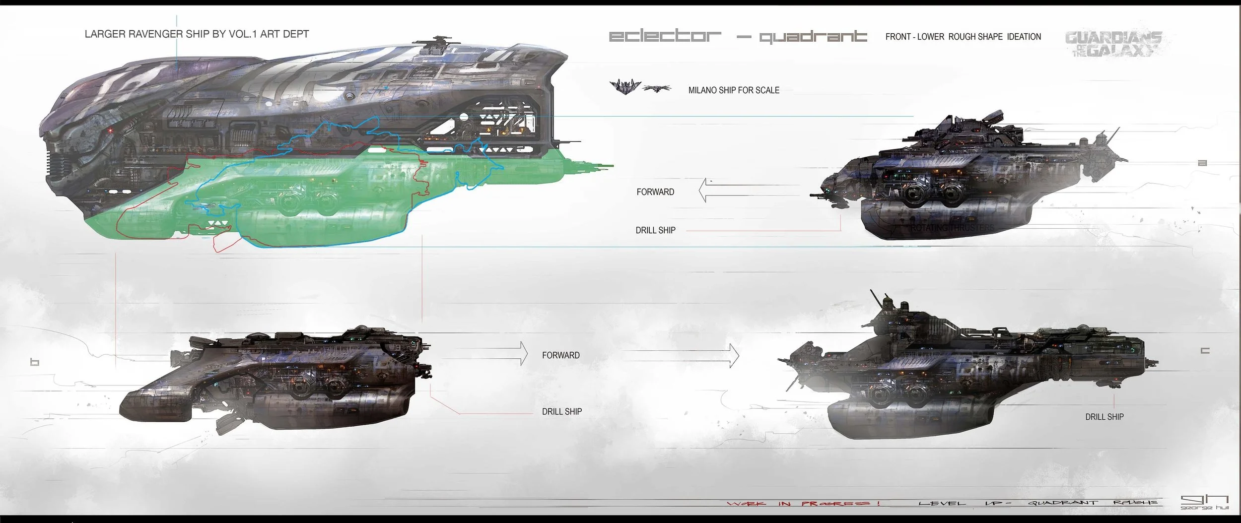 The ships designs, which were shared by senior conceptual designer George Hull, include the ship the Guardians end up flying in the end, the Quadrant, as well as the ship the Quadrant split itself from, the huge Ravager ship, the Eclector, and lastly the laser drill ship.