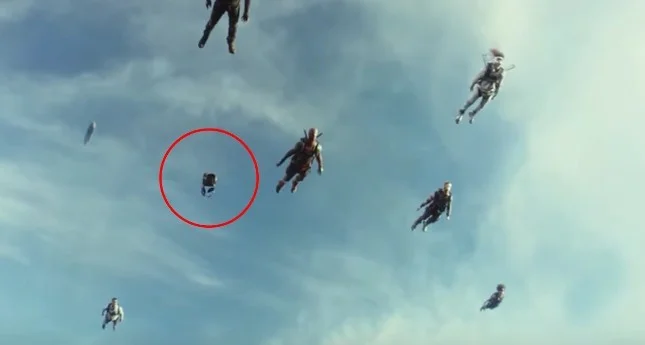 Now, I know you may be thinking that it's just a parachute pack that was just placed next to these characters. That was my initial first reaction, but it's the next screenshot from the latest trailer where the big reveal comes into play. It comes at the point where the team has already jumped out of the airplane and are free falling to Earth.