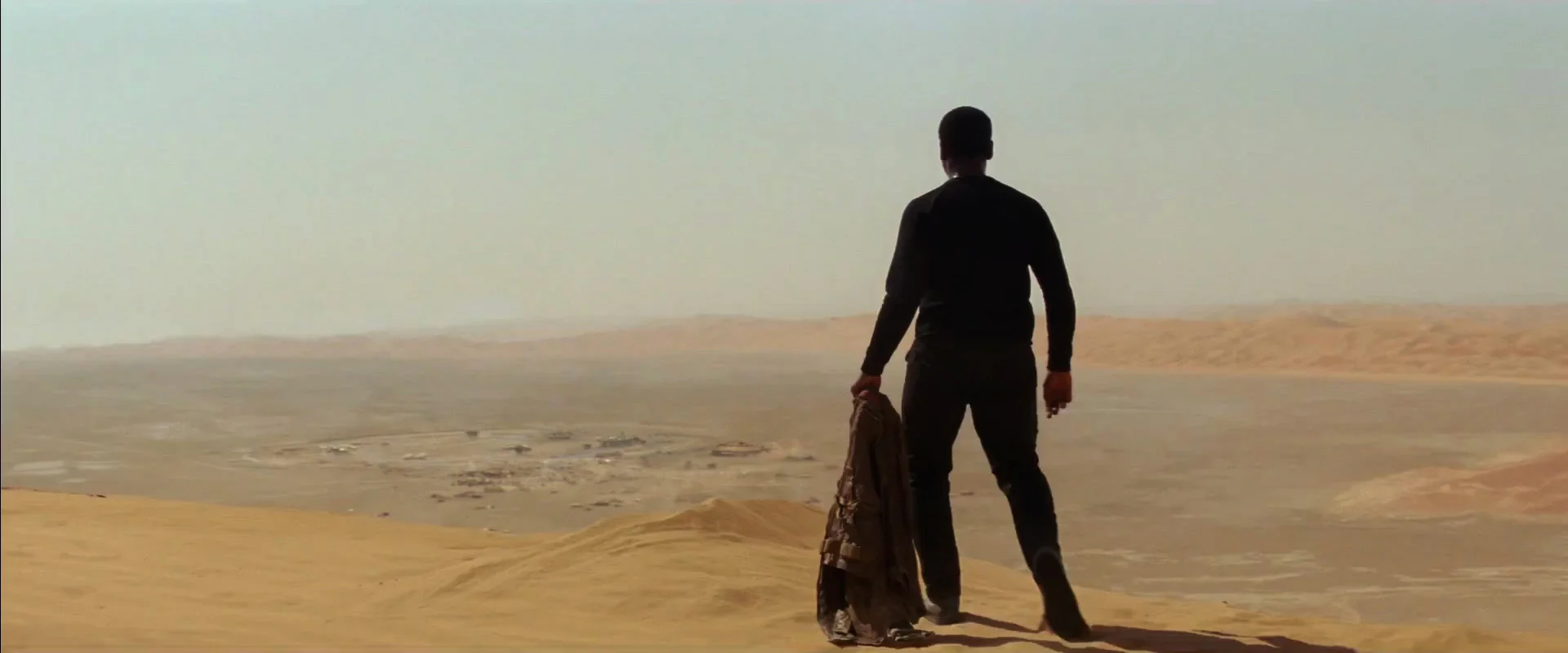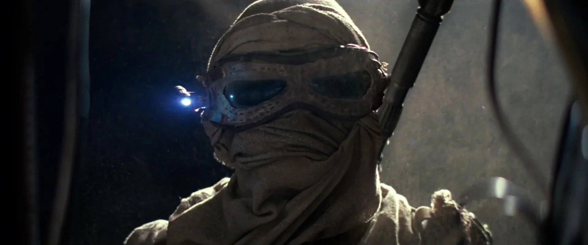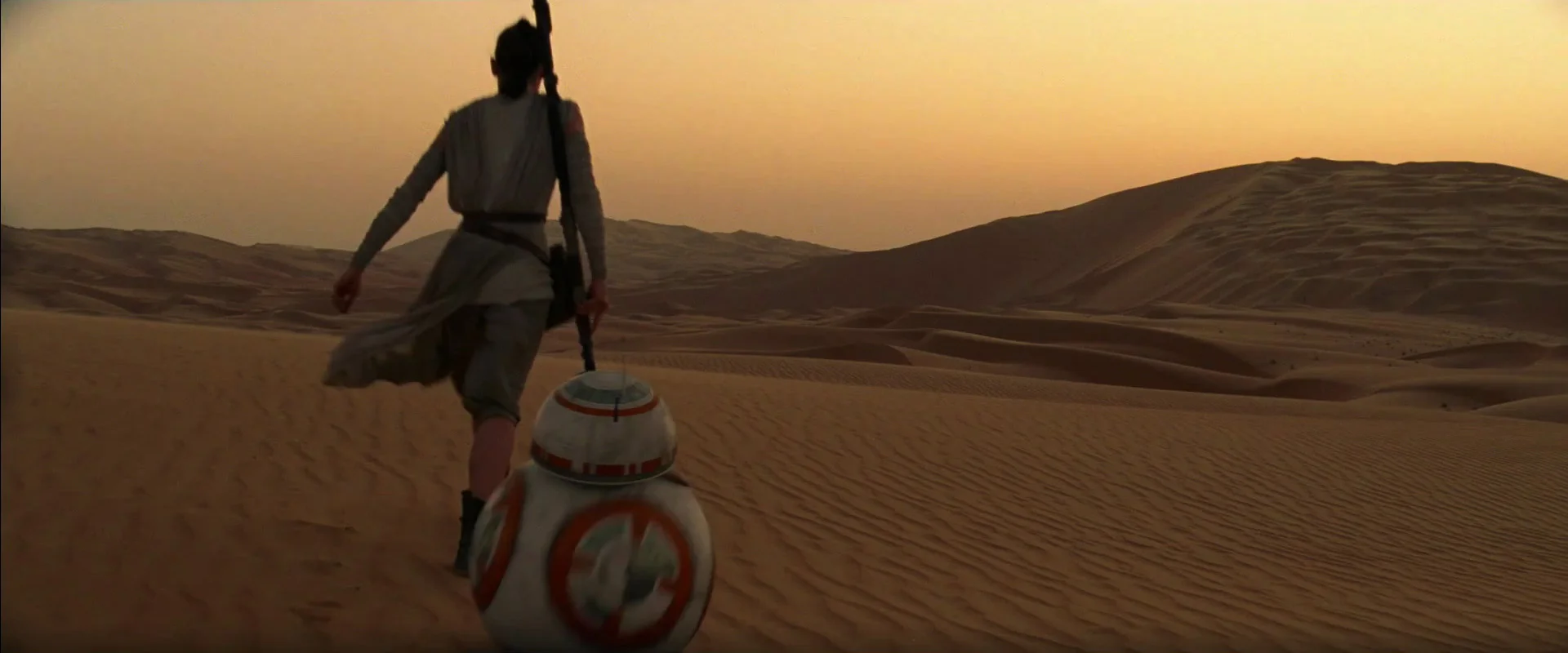 Let's start at the beginning. So far we know very little about most of the characters. We know Rey lives on Jakku (which is the desert planet we've seen in all the trailers), she's a scavenger, and a bit of a loner. I was really excited to see her in action, exploring what looks to me like the inside of the crashed Star Destroyer we've seen.