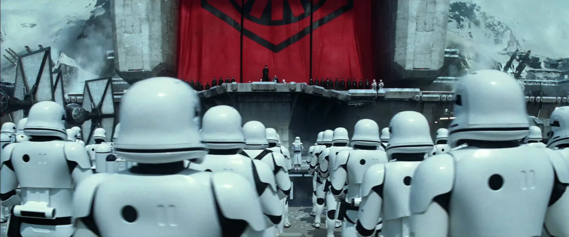 Next we're treated to a pan of a mysterious figure speaking before the amassed forces of the First Order. If you zoom in it's clearly Captain Phasma standing just to the right of the speaker, and they appear to be wearing an Imperial uniform. I believe this to be General Hux, and this to be Starkiller Base, which he commands. This may be in preparation to attack the Resistance forces, or to prepare for an attack by them.
