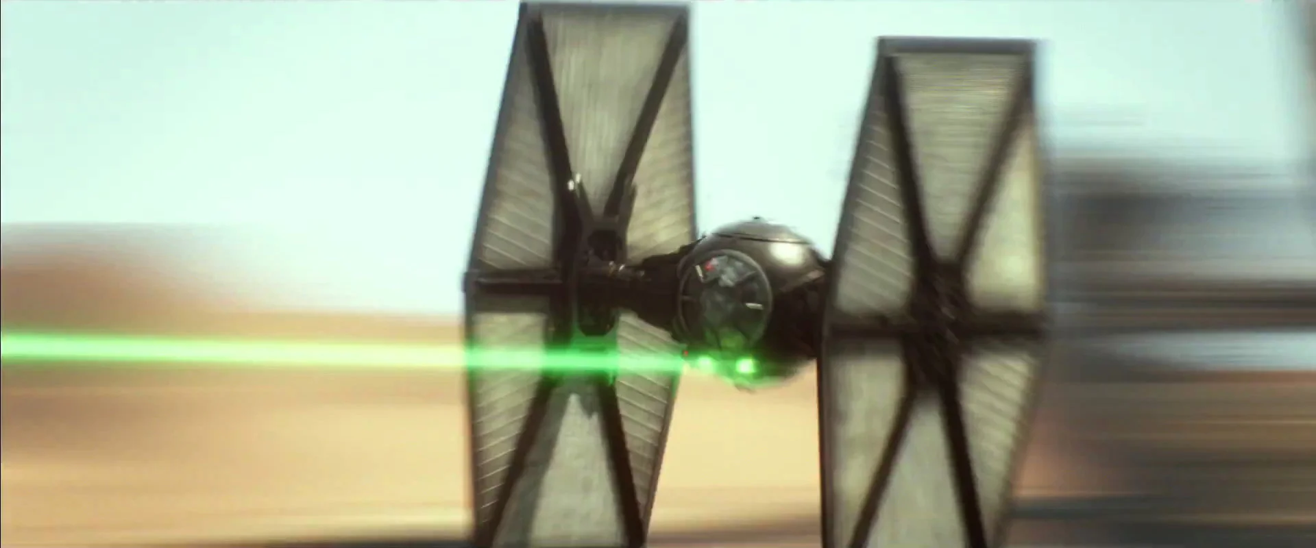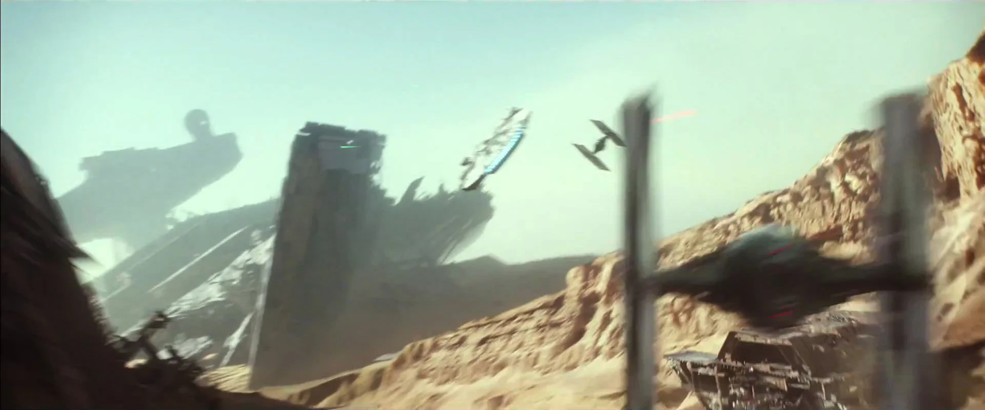 We get a beautiful pan of a TIE fighter, presumably Finn's, spiraling toward a planet that is most likely Jakku. I think these will be in the beginning of the movie. We'll start with Finn fighting his way out, stealing a TIE fighter, being shot down, then we'll be introduced to Rey as seen in the earlier shots.