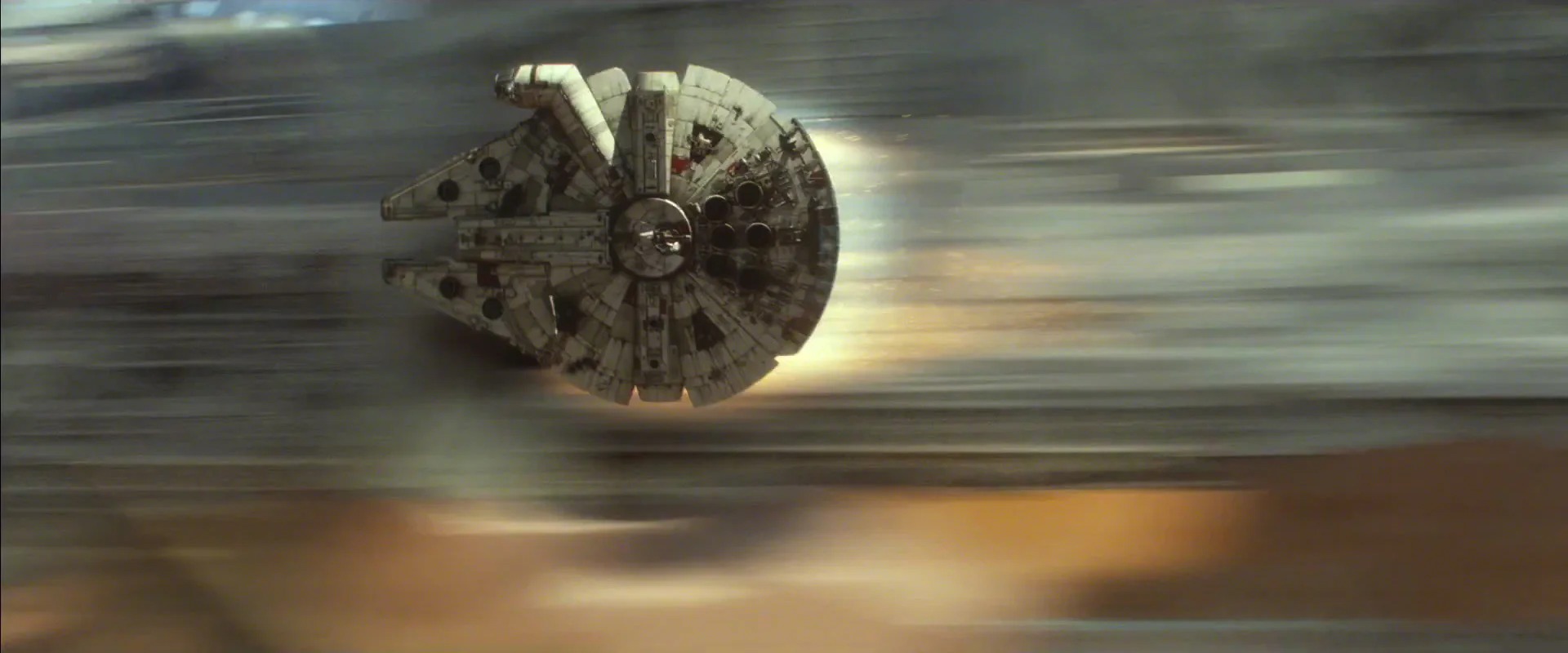 We get a great shot of the Falcon traveling through hyperspace (which admittedly looks a lot like one of the scenes from JJ's Star Trek into Darkness.)
