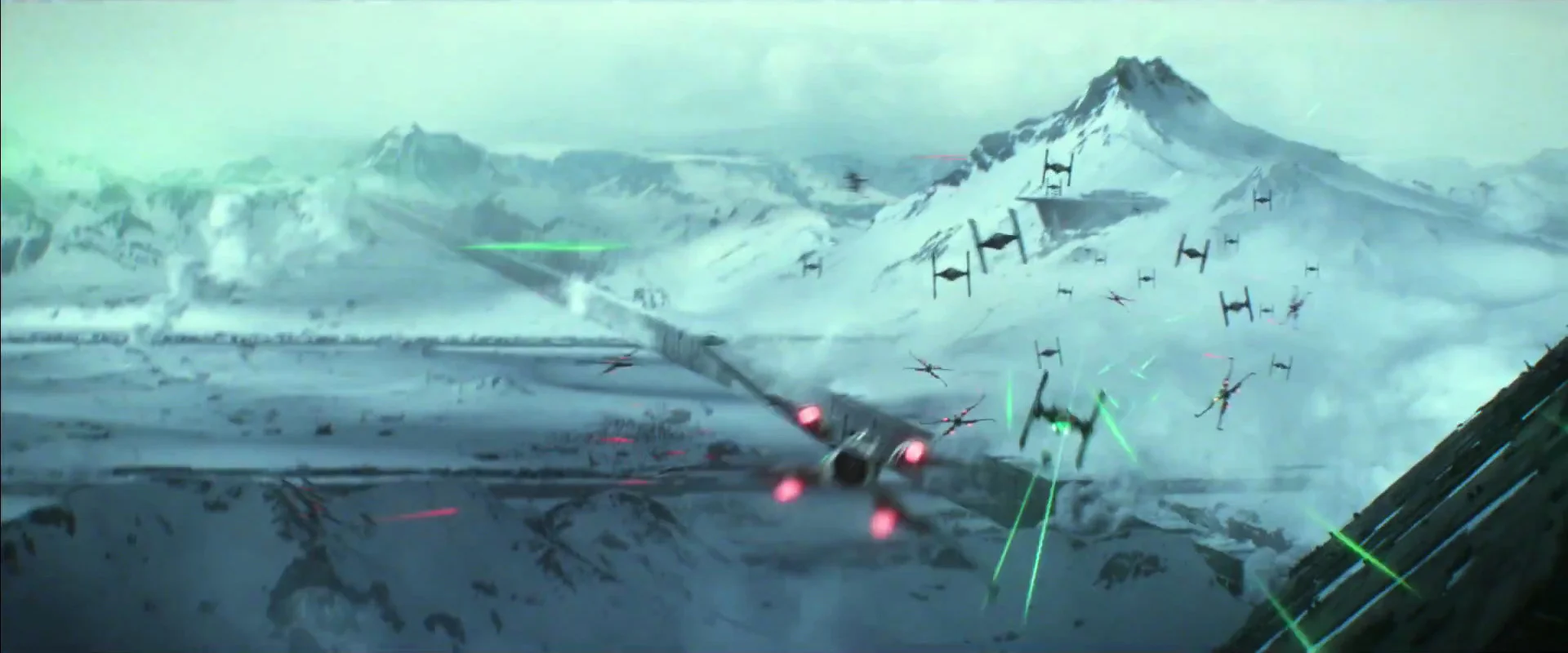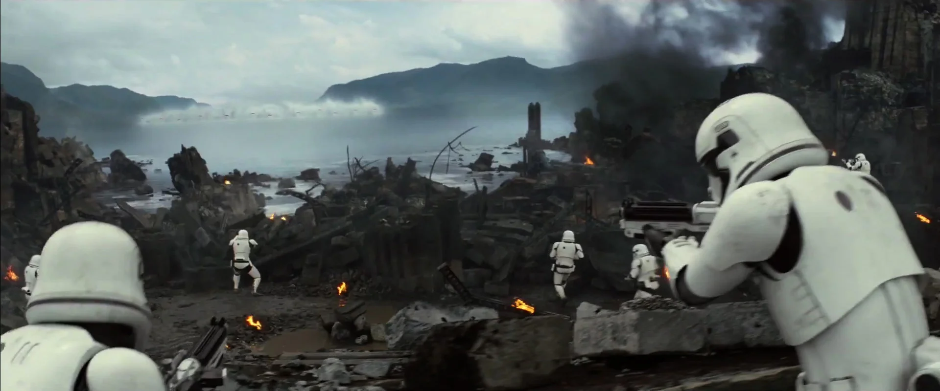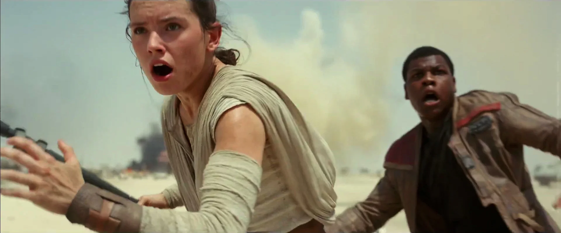 We're treated to several shots of X-wings, stormtroopers, dogfights, and the like. You know, your typical Star Wars goodness. We get a quick shot of Rey and Finn being stopped in their tracks by an explosion.