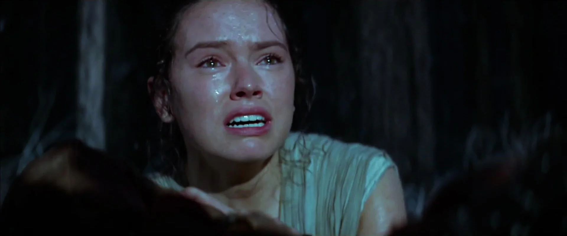 Rey is crying over what looks like a body. This looks like one of two people to me. If at the beginning of this film Rey is a loner and spending her time on Jakku, then who could she have bonded with to cause this reaction? My theory is that if Kylo is Jacen, Rey is his sister Jaina. If she is the daughter of Han and Leia, either of these will work: Chewbacca or Leia. Now the right side of the shot looks like fur, and in the bottom right corner appears to be Chewbacca's bandolier. It could also be a jacket worn by Leia, as the left side looks like her hair. I know, that's loose. But this reaction would certainly be warranted by the death of her mother.