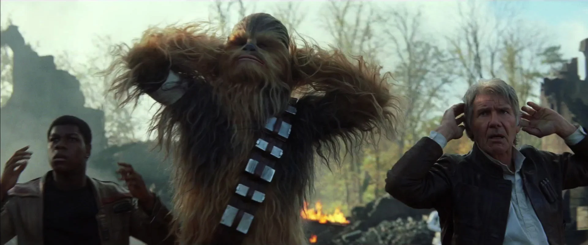 Now what could cause Han and Chewie, who have been professional criminals, resistance fighters, military leaders, and have been on the lam or in hiding for years at a time, to react in such a fashion. Clearly they were about to be arrested, and based on some of the other shots in the trailer, it looks like they have been a part of the battle all over this footage. So what could have caused them to be so shocked? Shot in the dark here: Luke. We've seen strangely little footage of Luke in the trailers so far, but if Luke were to arrive in the nick of time to save his friends from certain death, that could certainly spark such a reaction.