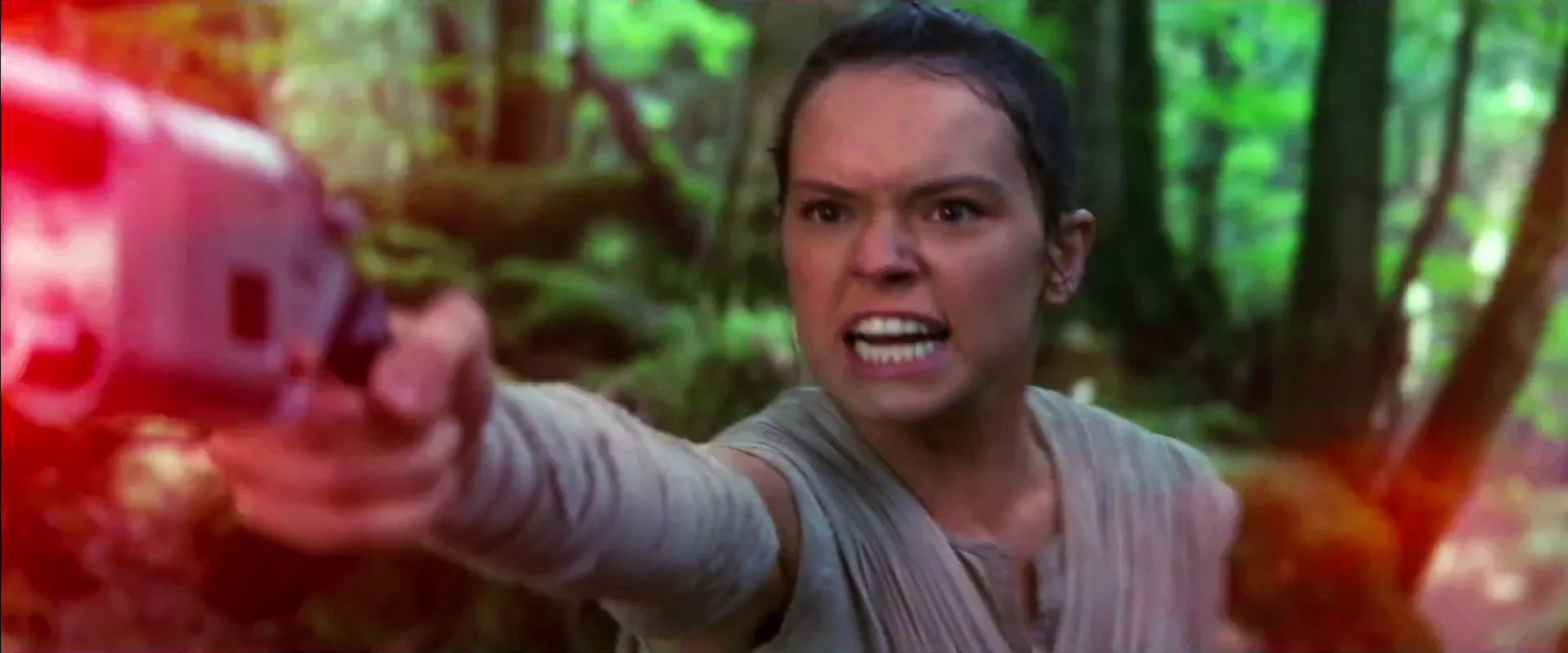 That's anger if I ever saw it. I think this is following her scene with whomever's body she is crying over a few seconds before this. Whoever killed that person is going to face the wrath of Rey shortly thereafter.