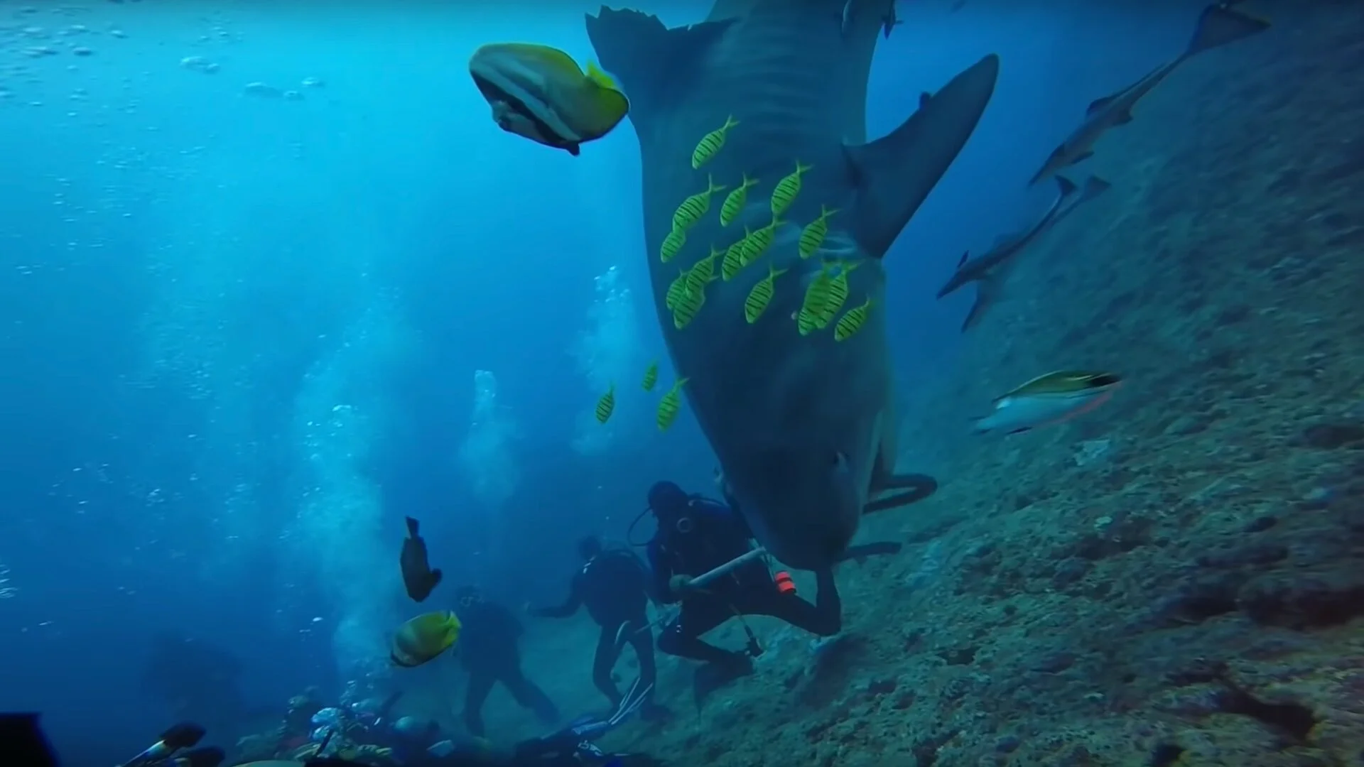 I’ve got a crazy video here for you to watch that features a group of Indonesian divers off Beqa Island in Fiji in shark-infested waters. A Tiger shark comes swimming in to try and bite the head off one of the divers! Luckily another diver fought it off. The diver didn’t escape without injury, though, as his head was in the shark’s mouth! Here’s the story.