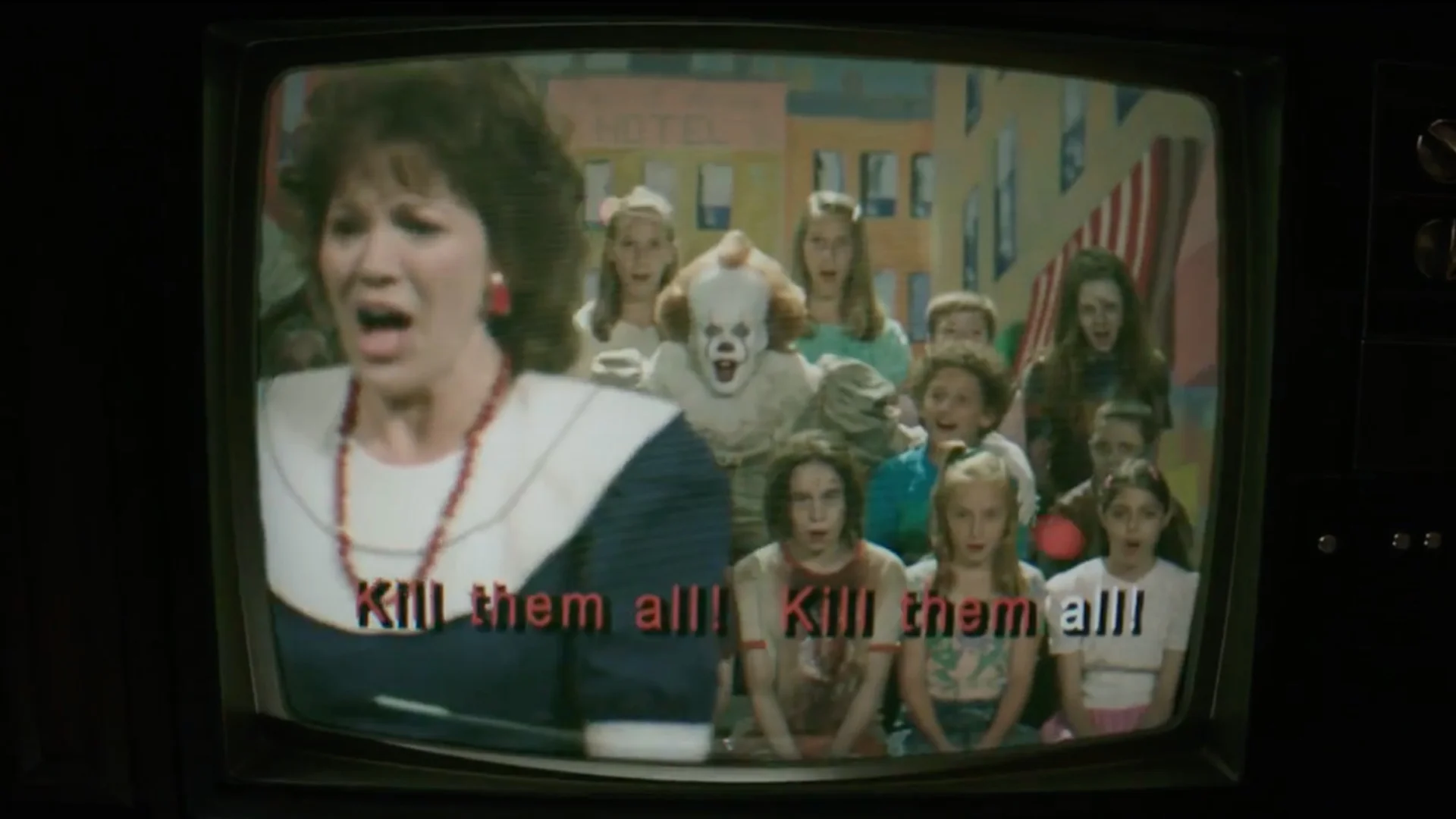 This latest spot offers up some footage from that we haven't seen yet. One of my favorite new clips features footage of a children's show on TV that show Pennywise the Clown sitting with a bunch of kids chanting "Kill them all! Kill them all!." Good times.