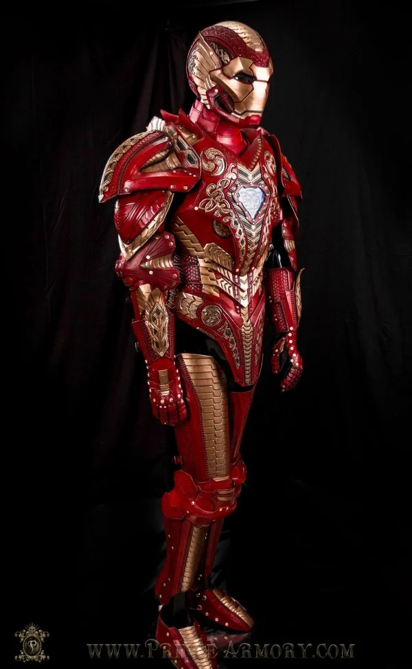This is a custom made suit of Asgardian Iron Man armor was inspired by the suits of armor you'd find on the home realm of Thor. It was created by Samuel Lee of Prince Armory, and it’s jaw-droopingly beautiful! It’s an all leather armor that also includes some brass hardware. The detail in this thing are absolutely stunning in every way. It’s truly a work of art.