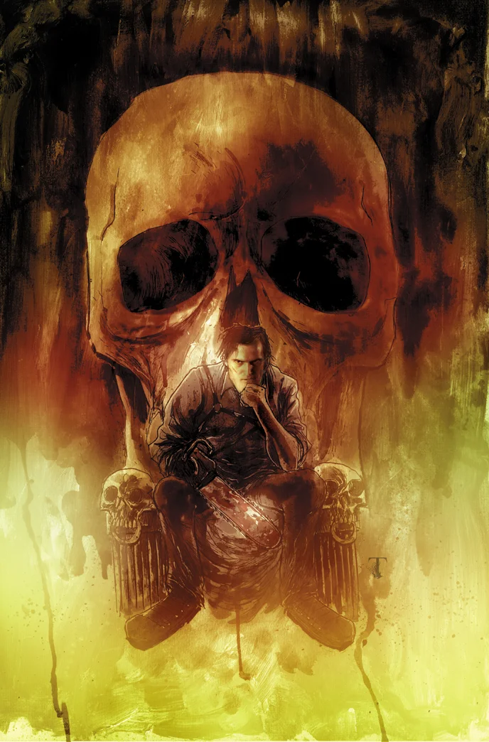 Here's a piece of TPB (trade paperback) cover art for Ash and the Army of Darkness that was whipped up by artist Ben Templesmith. I love the skull throne that Ash is sitting on as he's deep in thought. I really hope that Sam Raimi finally gets around to making Army of Darkness 2.