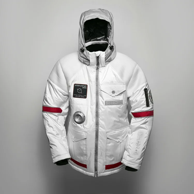 The design of the jacket takes inspiration from the classic spacesuit and offers many technical features as well as excellent protection from the elements . The exterior of the jacket is made from a unique trilobal fiber which is both waterproof and light-reflecting. The hood includes built-in speakers, controllable via Bluetooth® or via the integrated remote on your sleeve which also allows you to effortlessly control your phone. The jacket comes in a special SPACELIFE ambassadors kit, containing various space-inspired accessories.