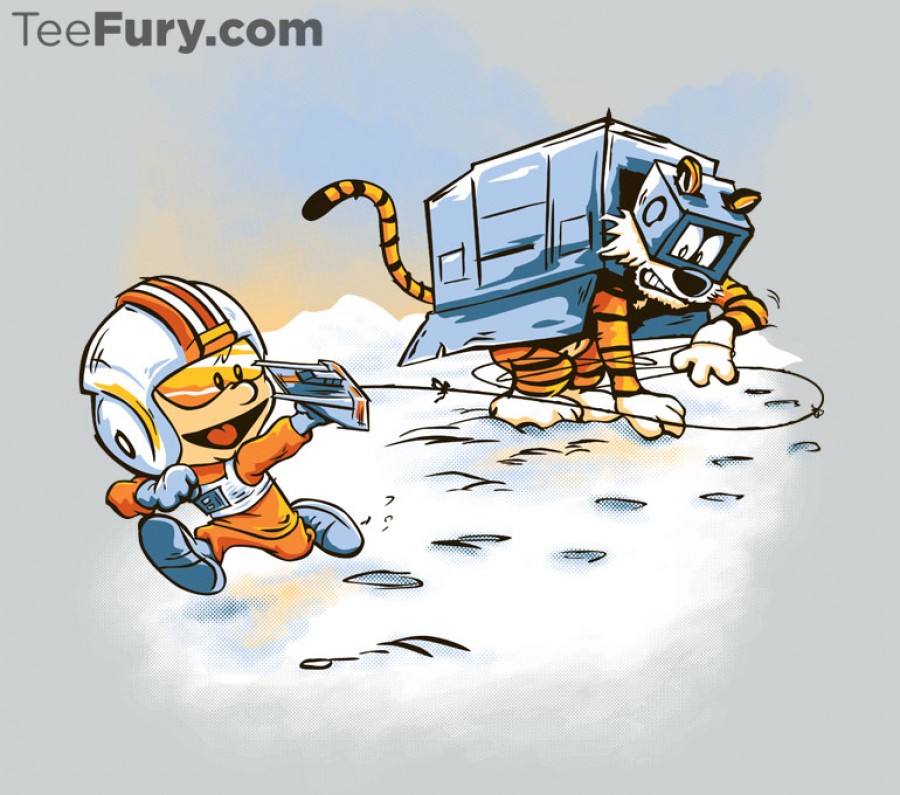 We’ve got another great Calvin and Hobbes and Star Wars mashup for you to check out. It’s called "Attack of the Deranged Killer Snow Walkers," and it’s one of those designs that just makes me happy. It features Calvin and Hobbes reenacting the sequence during the Battle of Hoth in which Luke Skywalker takes down an AT-AT with his ship's tow cable.