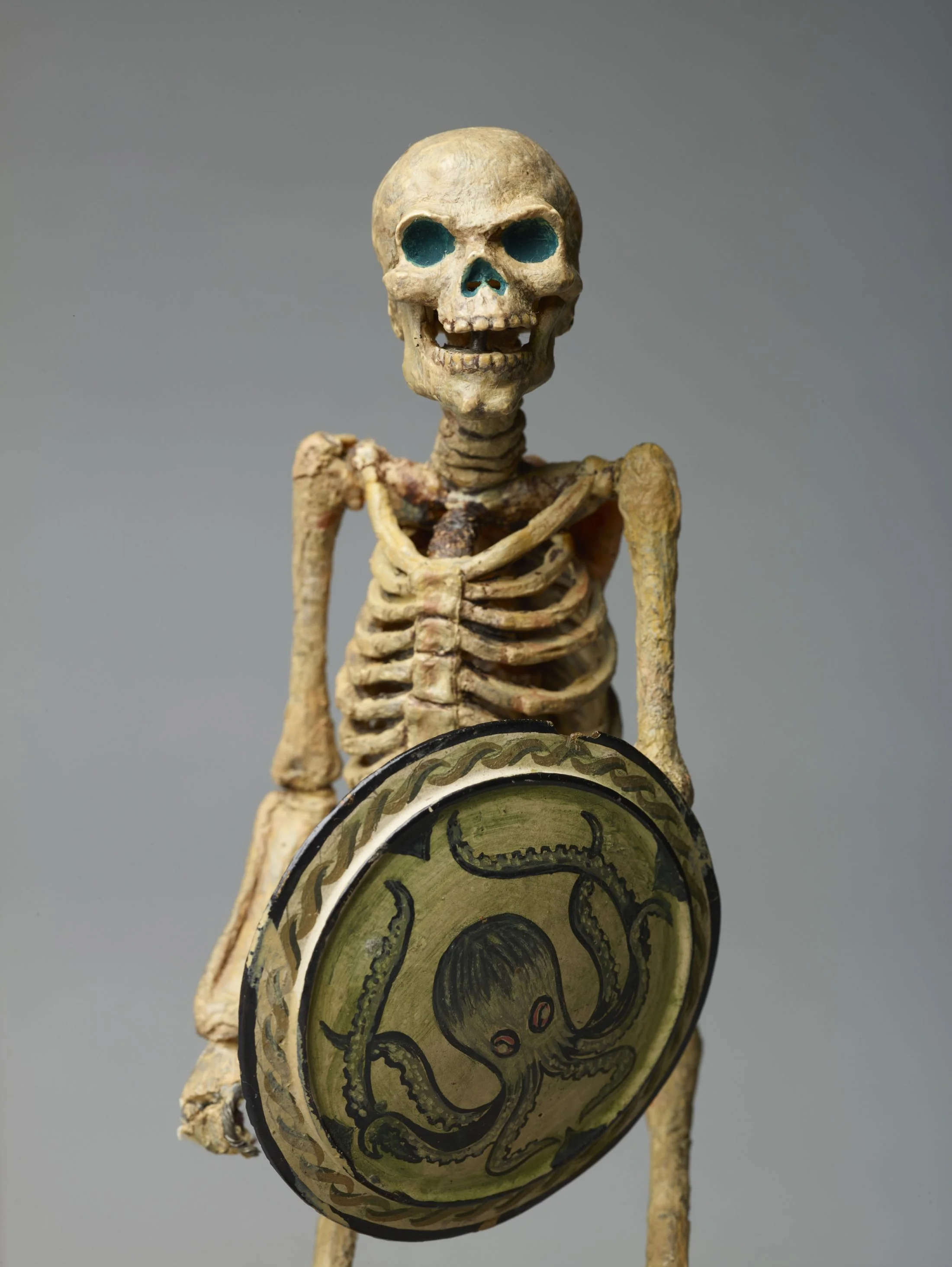 Original Skeleton model from Jason and the Argonauts, 1963; octopus shield by Ray Harryhausen (1920-2013), armature by Fred Harryhausen, c.1962 Collection: The Ray and Diana Harryhausen Foundation (Charity No. SC001419) © The Ray and Diana Harryhausen Foundation Photography: Sam Drake (National Galleries of Scotland)