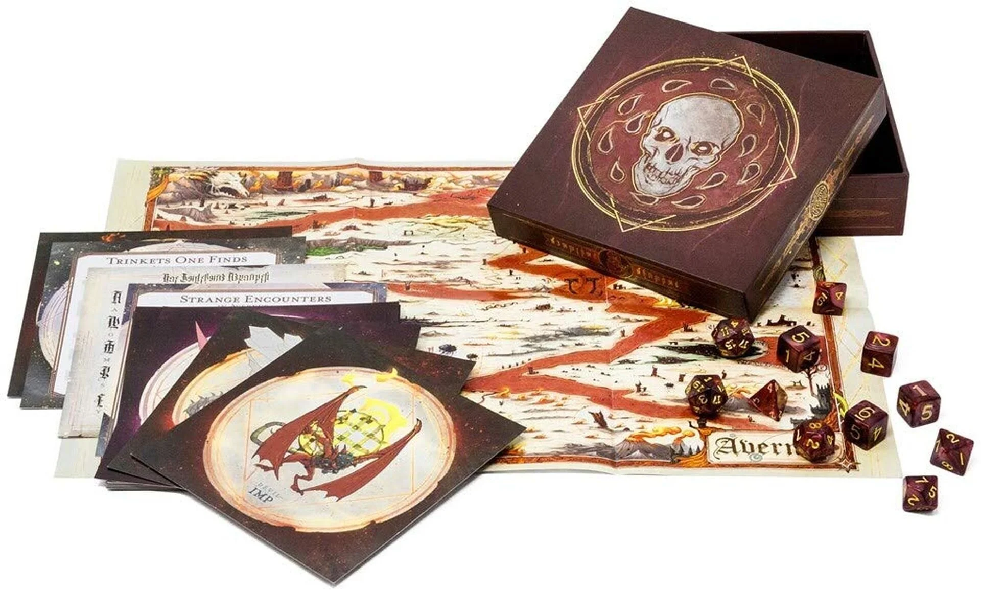 Outside of the dice and dice trays, you also get a foldout map of Avernus, a size comparison of demons and devils, a guide to Infernal, two cards with encounter tables, and 18 cards with story content about the different devils and demons in the Blood War featuring art by Max Dunbar.