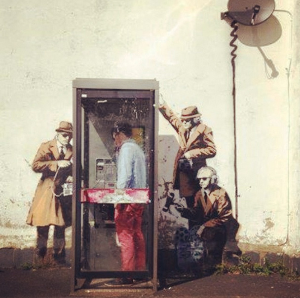 This is (allegedly) Banksy’s latest artwork. It is so far unconfirmed, but it is in the famed street artist’s style and seems to have something of his wit. The graffiti showed up on the side of a house in Cheltenham, England on Sunday morning. It shows three security agents spying on a phone booth (Look, you guys! It’s an actual phone booth! I thought they were extinct.), and what makes this piece so uniquely Banksy is that it is just down the street from the Government Communications Headquarters, which is the home of the UK’s entire intelligence apparatus.