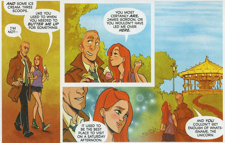 The fact that he tells Barbara of his new position is surprising in itself, though Barbara's reaction is not. He had the job for a few weeks and told her. She's had the job for years and never even mentioned it. I imagine that might bring with it some feelings of guilt. With the current direction, it seems that might be changing by the end of this arc, but the ride to get there should be fun. Stewart and Fletcher seem to really have a handle on the duo's ebb and flow, and their closeness comes clean through the page.