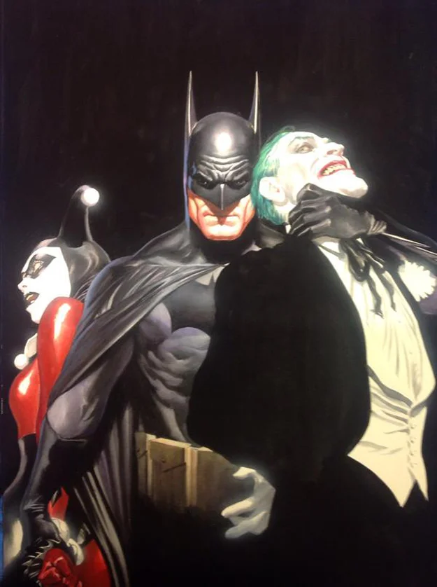 Artist Alex Ross released this new piece of Batman art he created for San Diego Comic-Con, which features The Dark Knight forcefully holding onto the Joker and Harley Quinn. It's called "Mind of I Cut In?" This painting is actually a sequel to the classic piece he created back in 2003 called "Tango With Evil," which I included for you to see below.