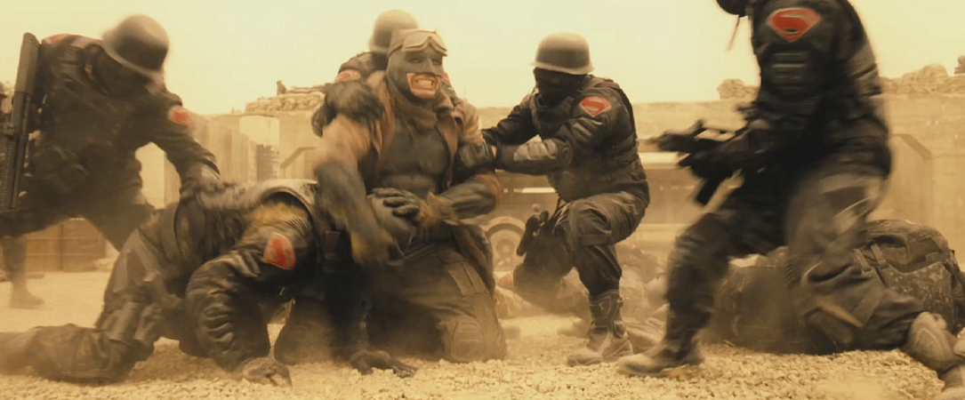 BATMAN V. SUPERMAN - Close-Up Shot of Batman's Desert Battle Uniform and New Banner