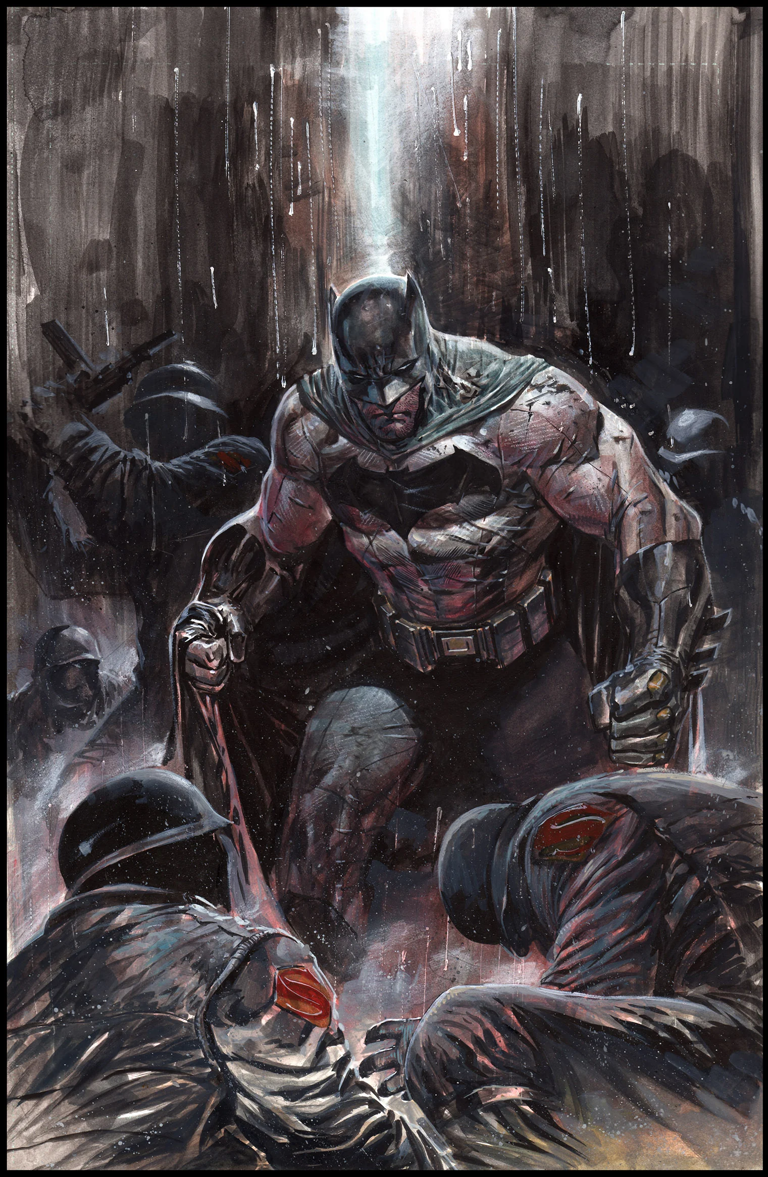 This menacing piece of fan art was created by Arian Syaf, and it feature Batman beating the shit of a few Superman security-type soldiers. You know, because Superman needs an army to protect him. The piece was done in watercolor, and as you can see it turned out pretty awesome.