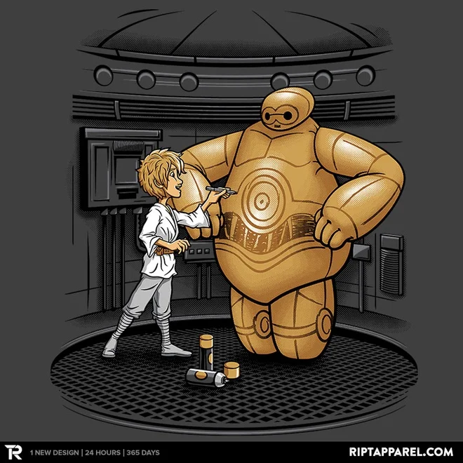 Check out this humorous piece of art that mashes together Disney's Big Hero 6 with Lucasfilm's Star Wars. It's called "C-6PO," and it was created by Ript Apparel user DJKopet. If features Luke Skywalker in the place of Hiro, and a big ballooned looking C-3PO in the place of Baymax. I like how Luke has spray painted the robot and is now detailing him with a marker.