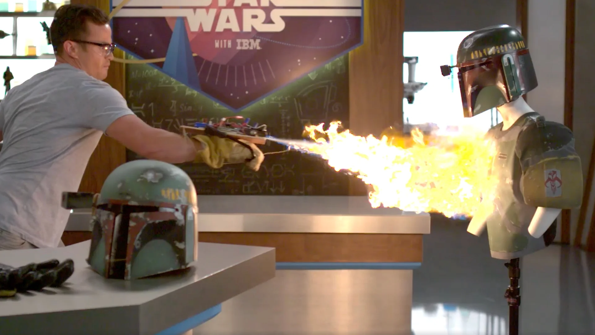 Star Wars has teamed up with IBM to bring a really cool video series to the internet called Science and Star Wars. This series tackles technological topics from the Star Wars universe and looks to see how close our world is getting to that tech. They’ve talked about Robotic Limbs, Bacta Tanks and Carbonite, and now they talk about the most famous bounty hunter from Star Wars, Boba Fett. In this video, they discuss some of the tools Boba uses in the Star Wars films including his armor, helmet, jetpack, and most importantly, the wrist flamethrower.