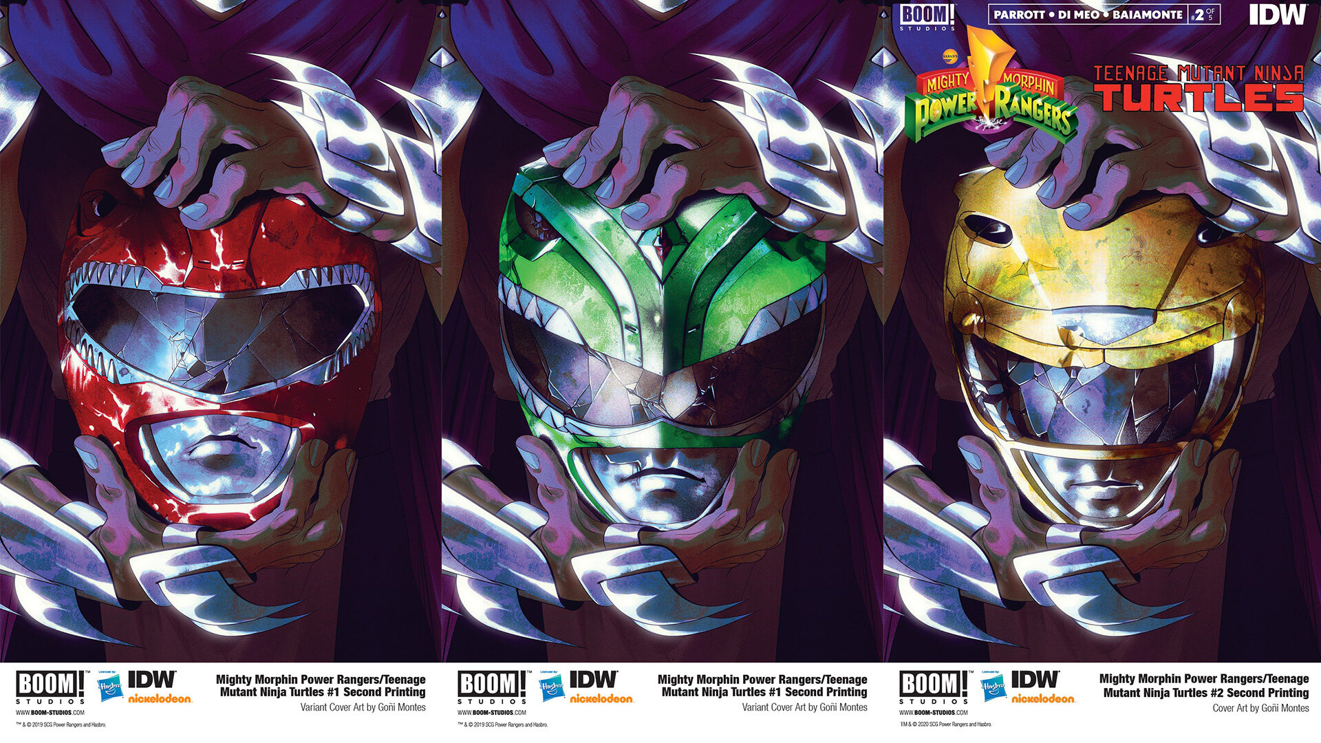 Mighty Morphin Power Rangers/Teenage Mutant Ninja Turtles #2 just came out the other day and both it and the prior issue have sold out now. That means new printings and new covers! The new covers come from Goñi Montes and feature Shredder holding a damaged helmet. I freaking love it! The second printings of each issue will be available on February 5.