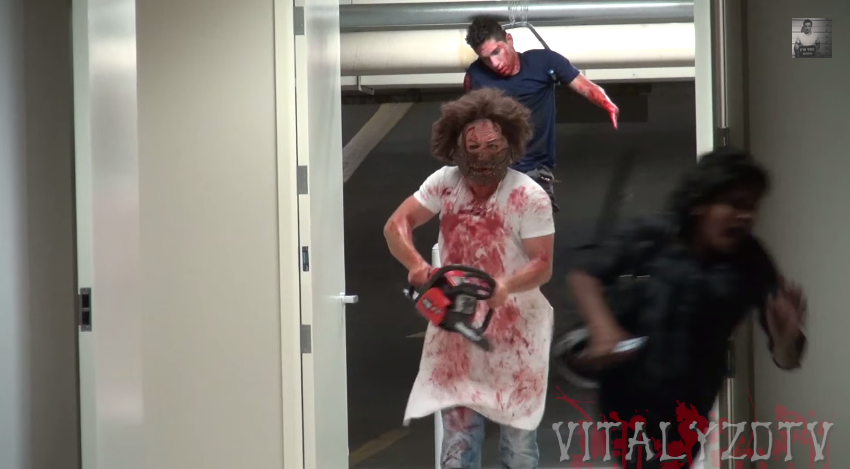For some Halloween and chainsaws just go so well together. It seems like at the end of every spook alley or hunted maze is a one or more guys waiting with chainsaws to chase you out. Those things just give off such a frightening and menacing sound. VitalyzdTv took the whole chainsaw bit to a new level, though, with this amazingly funny yet brutal chainsaw massacre prank that they held in a parking garage. Seeing something like this would actually kind of scare the living shit out of me!