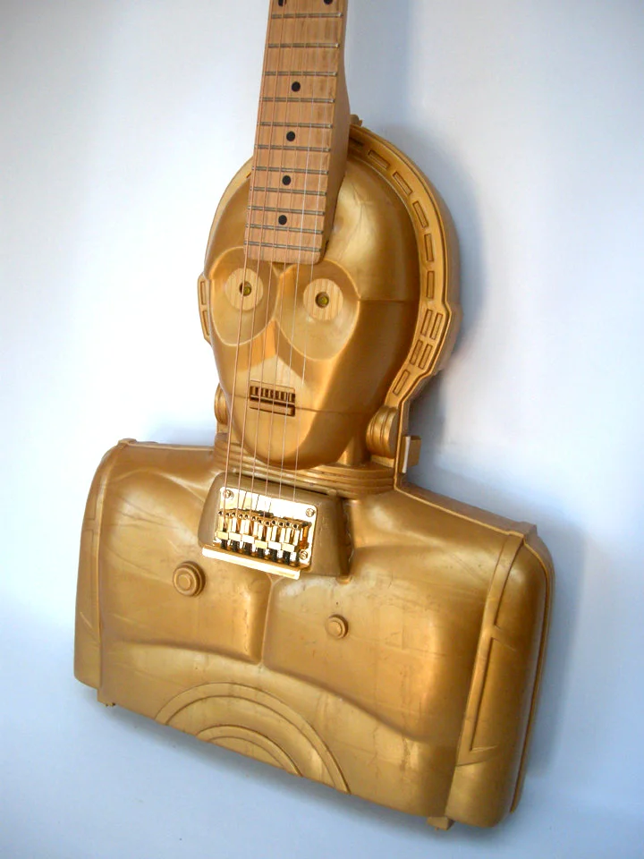 I’m guessing two groups of people are looking at this picture and screaming for two very different reasons. Toy collectors are probably up in arms because Etsy user Marc Potter just “destroyed” a perfectly good C-3PO collectibles case. And guitar players are likely exclaiming, “I need that right now!” I belong to the latter group, but I’m quite skeptical about whether this would actually sound good.