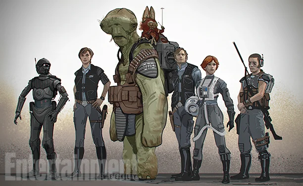 The concept art that has been released to promote the book features early alternate designs for Felicity Jones' Jyn Erso and the rest of the Rebel team, including the first version of Alan Tudyk’s hilarious droid character K-2SO. As you can see in the first image above, the original line-up of rebels had a very different look, and it even had a couple of alien species characters.