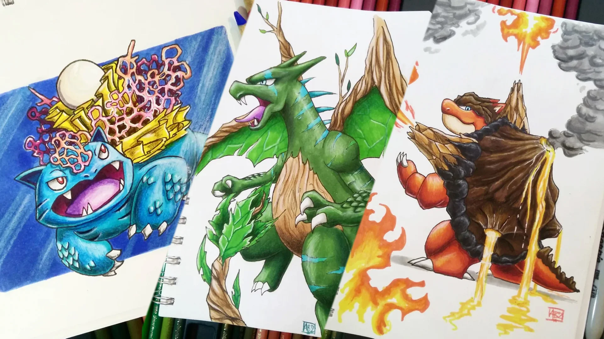 This artist has recently shared some amazing art that includes the final evolutions of the original starters (Venusaur, Charizard, and Blastoise) imagined with swapped typings. Venusaur becomes a Water-type, Charizard is now Grass-type, and Blastoise is a Fire-type.