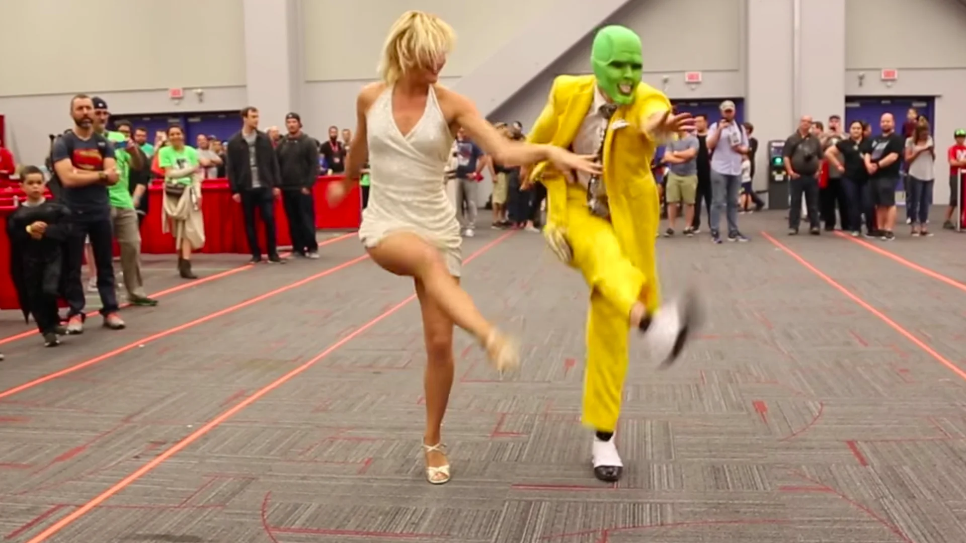 When The Mask came out in 1994, I was the perfect age for the movie to completely work for me on every level. I loved the outlandish larger than life comedy, the art deco production design, and the lead performances by Jim Carrey and a then-unknown bombshell named Cameron Diaz. I haven't seen the film in years so I'm not sure how it holds up, but it looks like these two cosplayers at Montreal Comiccon have studied it a lot, because they've recreated one of the dance sequences that took place at the Coco Bongo Club. I mean, some pretty ridiculous stuff happens in that sequence that isn't physically possible for humans to do (at one point, Carrey throws Diaz up in the air, dramatically checks his watch, and catches her), but these guys approximate it as well as possible.