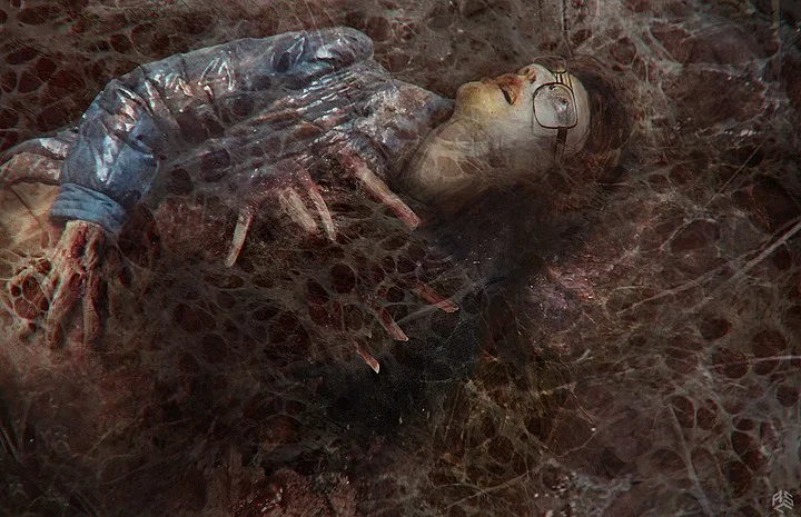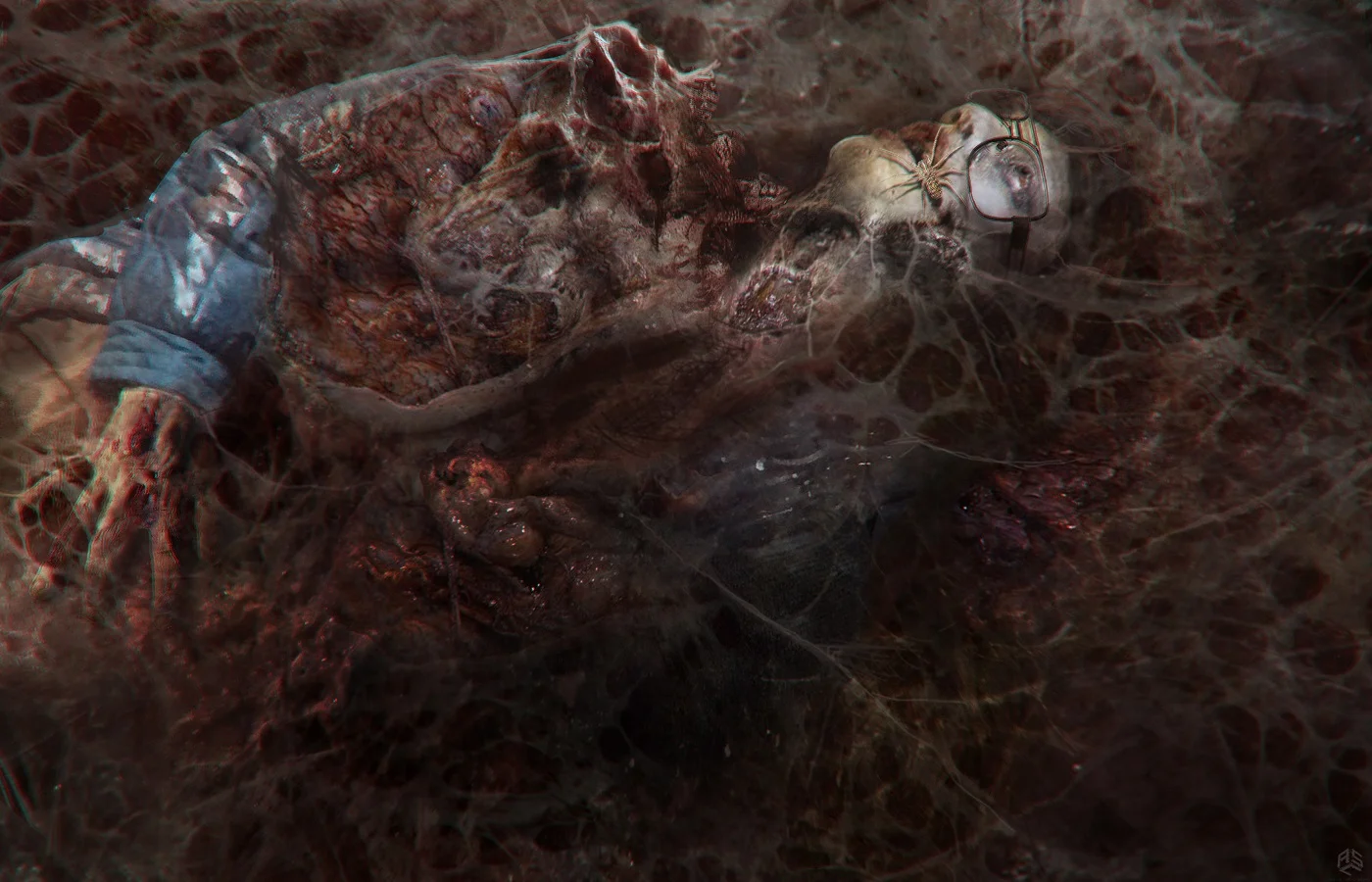 There's another piece of concept art that you can see below with a few different changes. For example, she's got a spider crawling out of her mouth. Sims explained why: