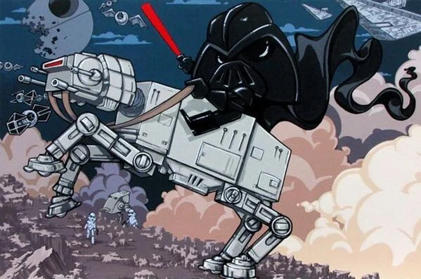 This amusing piece of Star Wars art comes from artist Michael Phillips. I came across his stuff while roaming artist ally at WonderCon last month, and I thought this would be a really fun piece to share. I love that Darth Vader is charging into battle on an AT-AT like a buckin' bronco.