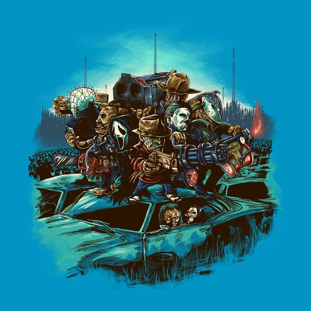 This spectacular horror movie themed t-shirt comes from Tee Public user bokien. It features an epic team-up of several of our favorite horror killers. The artist even offered a little story behind the the illustration that explains why these character have teamed up. This is a note from the artist. It's a little rough to read, but you'll get the idea: