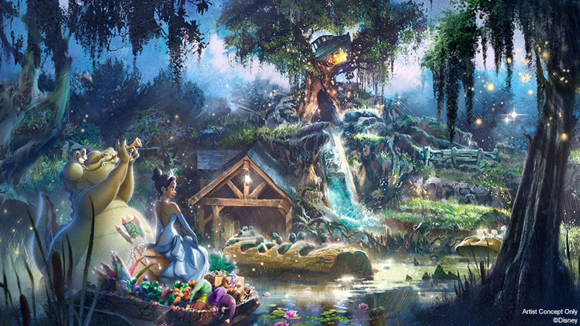 The attraction will “pick up this story after the final kiss, and join Princess Tiana and Louis on a musical adventure – featuring some of the powerful music from the film – as they prepare for their first-ever Mardi Gras performance.”